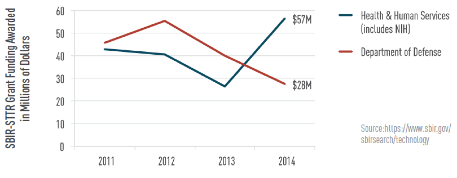 Funding agency 별로 보면 NIH/CDC/FDA등에서 $57 million, DoD (국방부)에서 $28 million의 SBIR/STTR 펀딩을 받았습니다. 아래 그래프에서 보듯이 Life science쪽 스타트업에 대한 지원은 늘어난 반면 DoD 쪽은 2012년 이후 지속적으로 하락하고 있습니다. 샌디에고 스타트업들이 NIH 등에서 받은 $57 million의 SBIR 펀딩은 NIH의 2014년 SBIR 총예산의 8%를 상회하는 높은 수준입니다.
