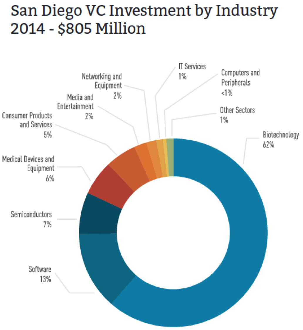 2014년 샌디에고의 스타트업에 벤처 캐피탈이 투자한 액수는 총 $805 million (약 9천억원) 입니다. 2013년에 비해서 약 10%정도 증가하였으니 일단은 긍정적이네요. $805 million의 투자금이 98개의 스타트업에 투자되었다고 하니 평균적으로 한 회사당 $8 million 조금 넘게 (약 90억 정도) 투자되었다고 볼 수 있겠습니다.