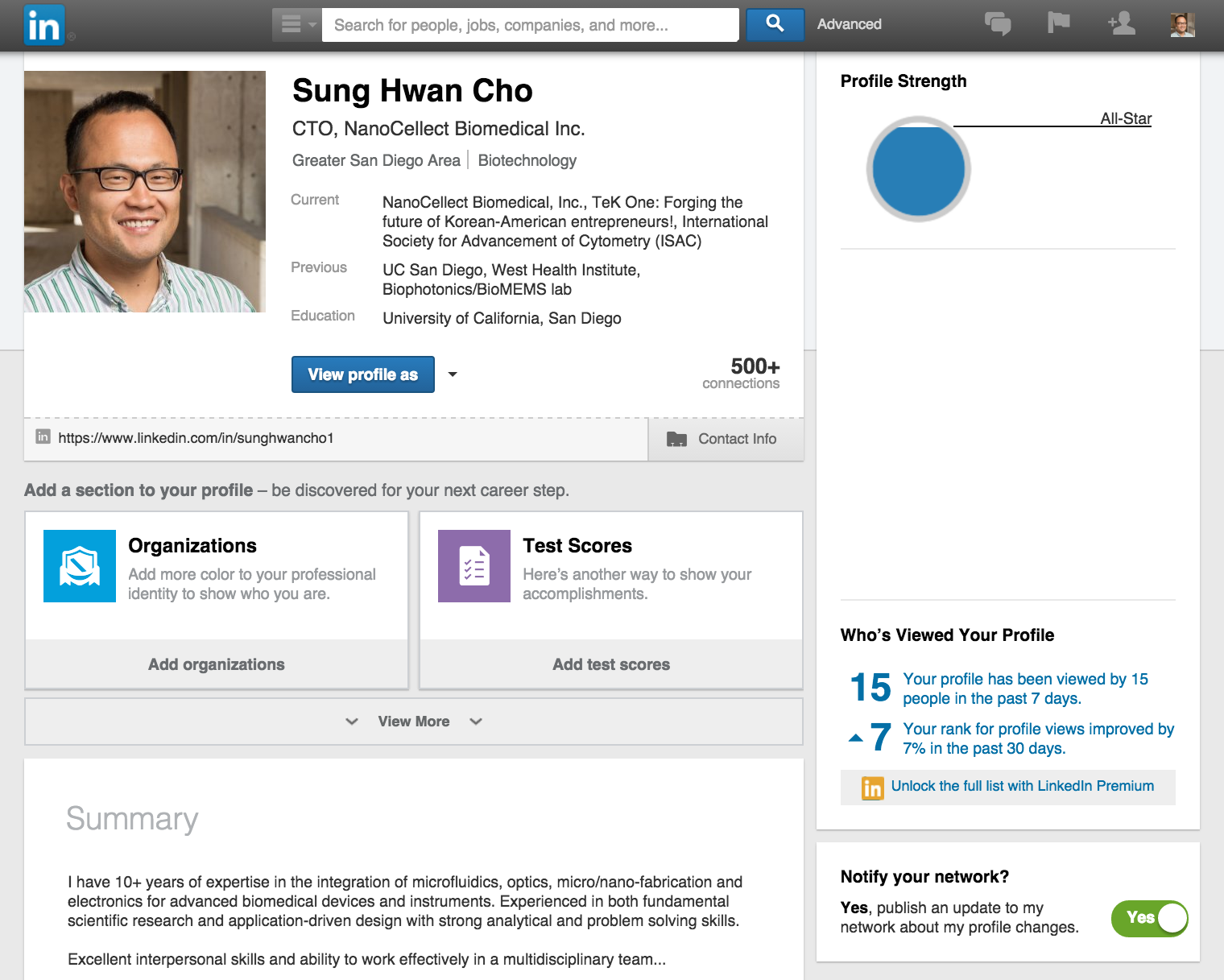첫째로 링크드인은 누구나 자신의 이력과 학력 등 경력을 올리고 자신을 마케팅할 수 있는 플렛홈이다